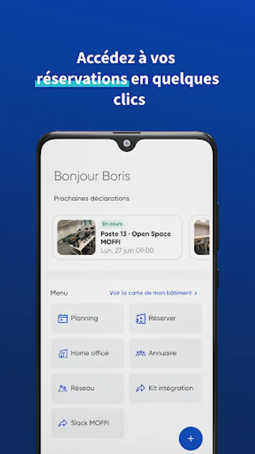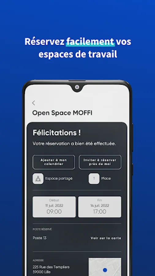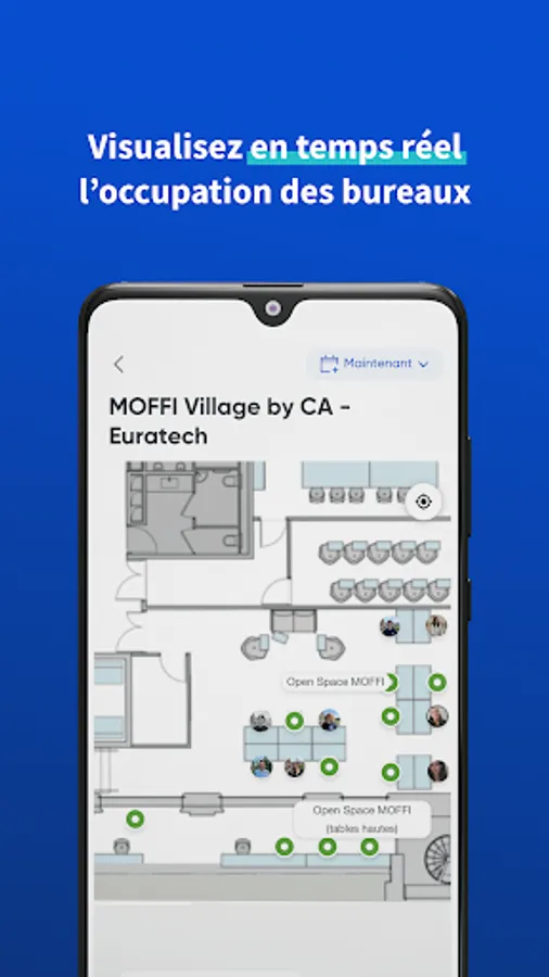 MOFFI is a smart-office solution, i.e. it makes offices smart to improve the employee experience. You can thus have access to the availability of your workspaces in real time with indoor mapping. You will also be able to connect MOFFI with tools such as Slack, Office 365 or Google and thus offer hundreds of functionalities to the user.