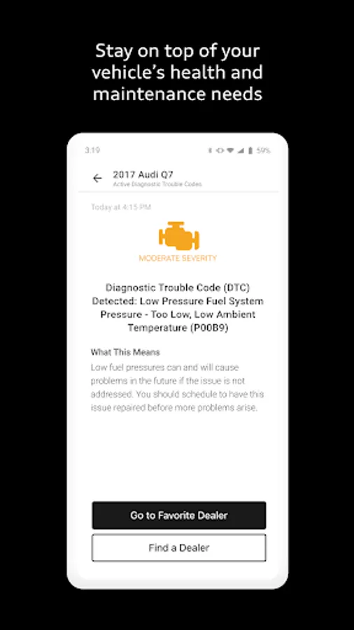 Keep an eye on your vehicle’s health in the app. If something happens, such as a diagnostic issue, you’ll be notified and provided with helpful information.