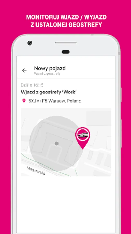Notifications about your car entering and leaving certain areas, for example entering and leaving your home or office (Geofence)