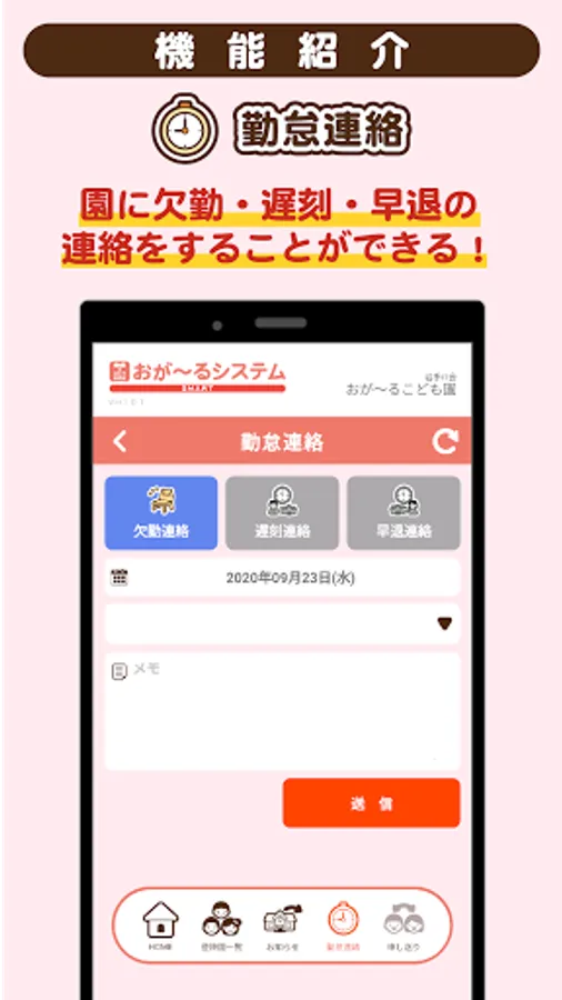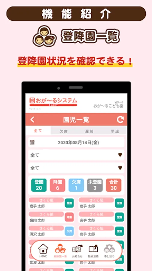"List of children going up and down" function that allows you to see the list of children going up and down, "Attendance contact" function that allows you to contact the facility late, leave early, or absent.