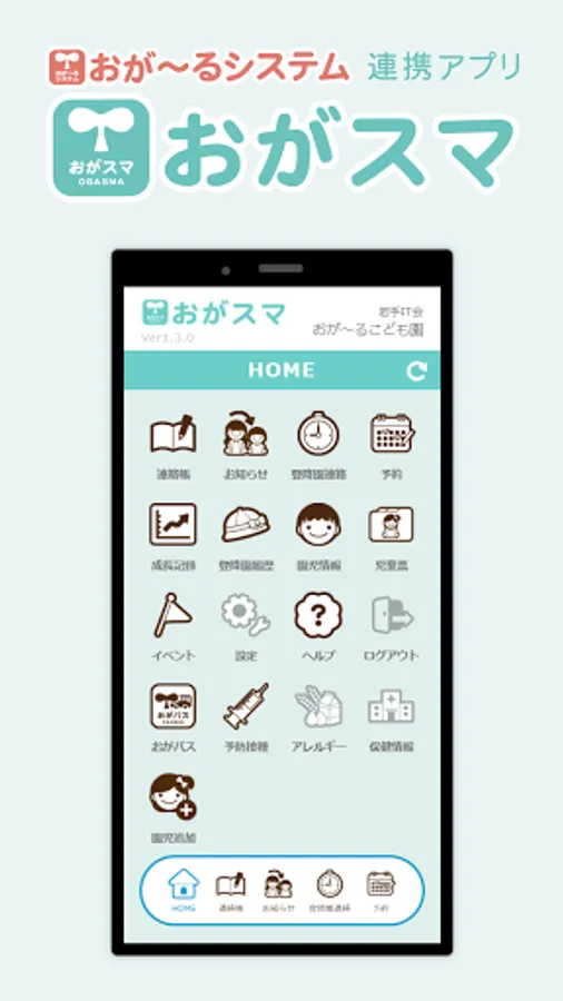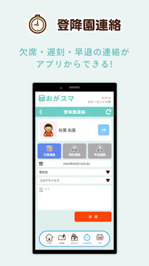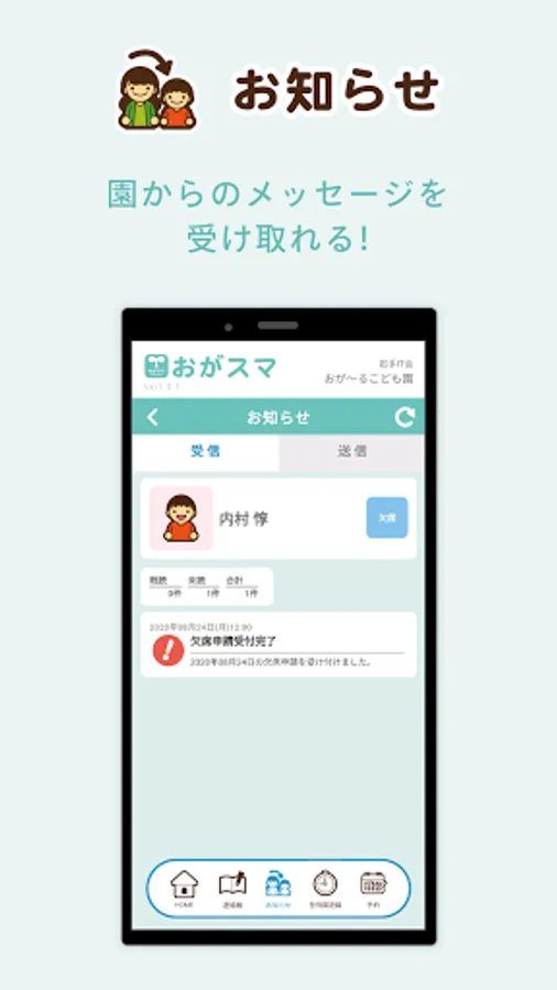 "Message" function to receive contact from each facility to parents, "late contact", "early leave contact", "absence contact" function from parents to each facility, and contact childcare such as Saturday The "reservation" function allows you to use the "contact book" that allows mutual contact between the facility and parents.