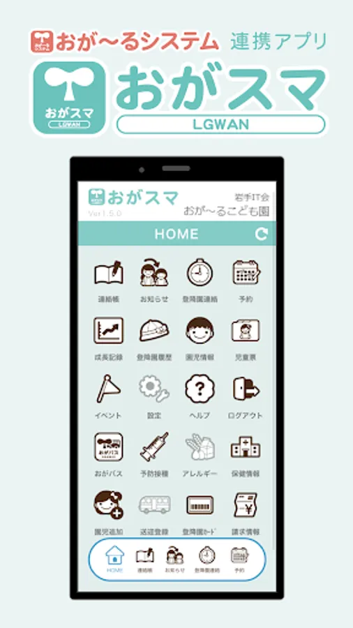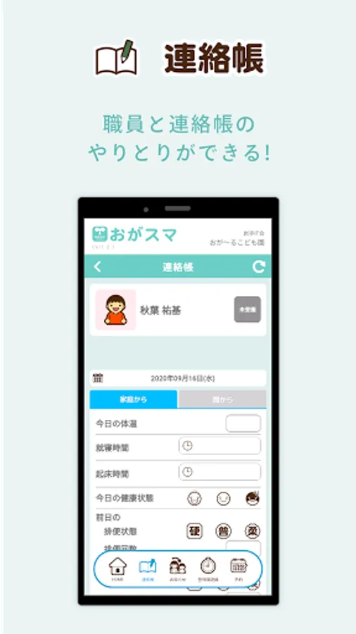 "Message" function to receive contact from each facility to parents, "late contact", "early leave contact", "absence contact" function from parents to each facility, and contact childcare such as Saturday The "reservation" function is possible.