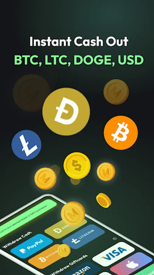 You can withdraw your rewards instantly in BTC, LTC, DOGE, or USD via PayPal (with 2,000 coins equal to $1.00 USD). Plus, we offer a variety of gift cards for you to redeem.