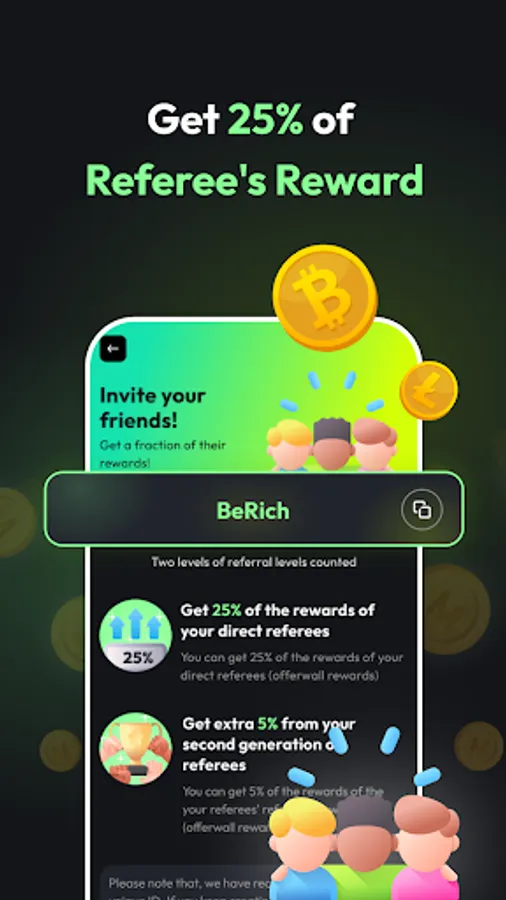 Invite to Earn! Invite more people in your team and earn money everyday! MoneyFree offers two levels of referral bonuses. You can get 25% of the offerwall rewards of your direct referees, and 5% of the offerwall rewards of your referees’ referees.