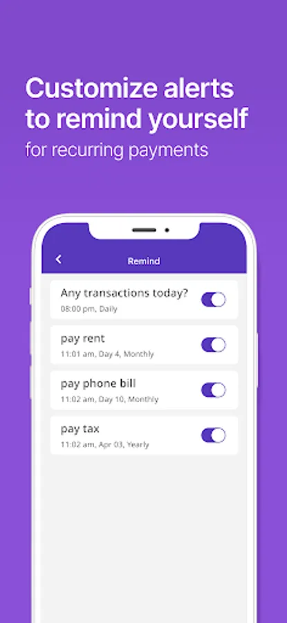Record-keeping Reminder: Customize your daily reminder time, so you'll never forget to record your transactions again.