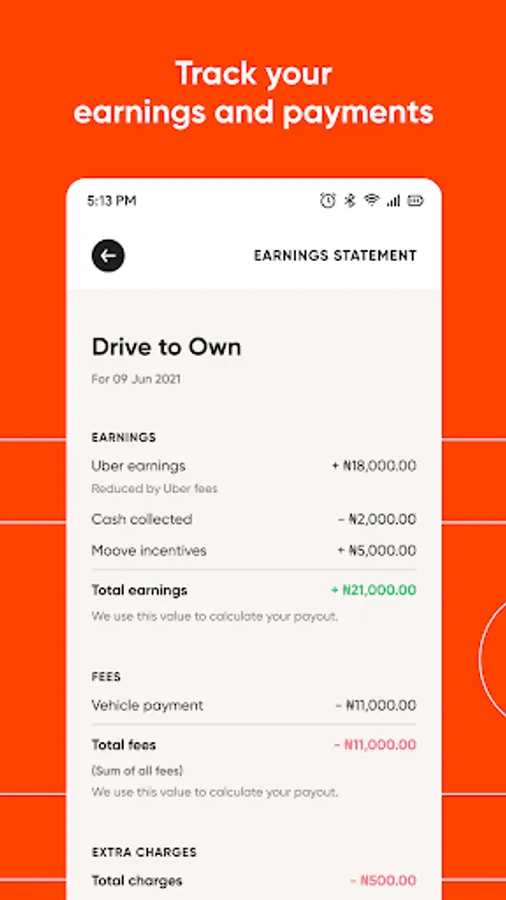 You can check out your driver profile, track your performance, and manage your finances, all through the Moove app. In addition, you will have the ability to carry out multiple transactions, including making payments to Moove, as well as to family and friends.