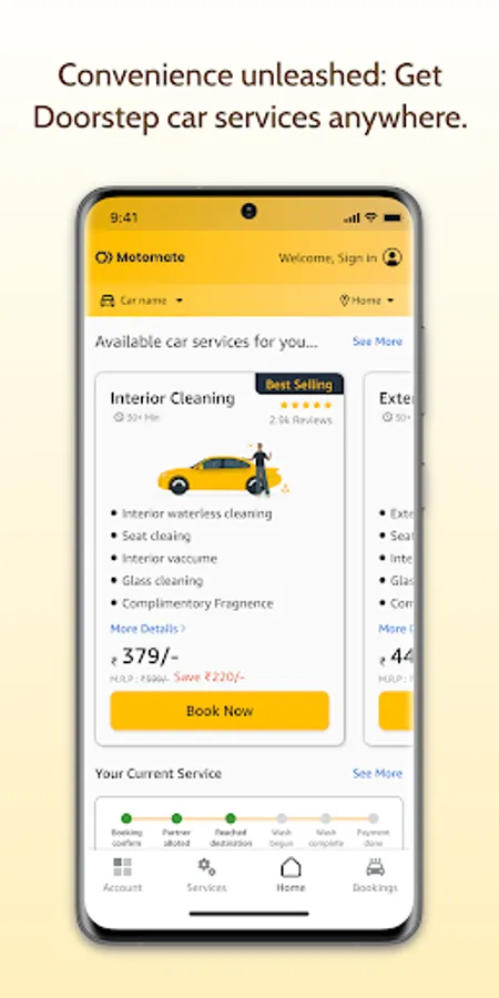 Motomate allows users to book various car services through its mobile app or website. Users can choose from a range of services, such as waterless exterior car cleaning, interior car cleaning, external wax, interior polish, and more. Users can also select the time and location of their preference for the service.