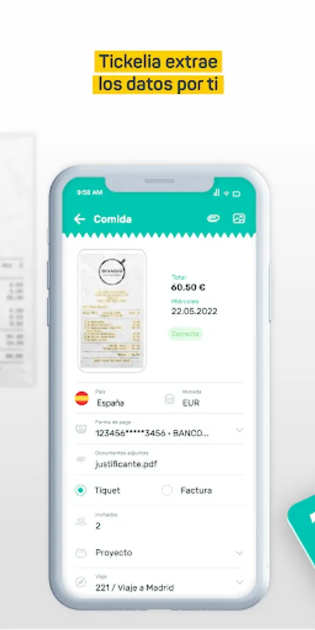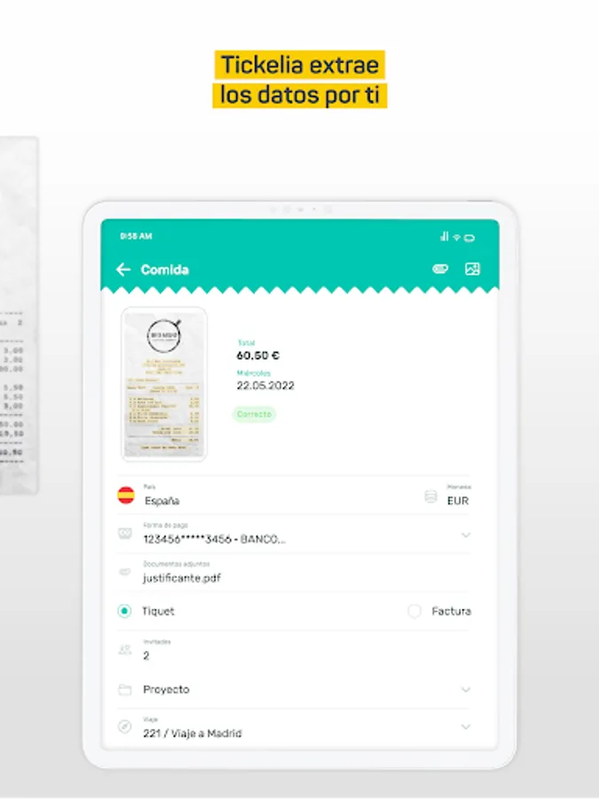 Tickelia is in charge of managing your expenses so that you forget about manual tasks on paper. Fully manage the flow of your company such as approval, control of spending policies, management of advances and trips, up to payment and accounting with your ERP. Automates and digitizes the expense note management process with all the legal guarantees thanks to the approval by the Tax Agency of multiple countries.
