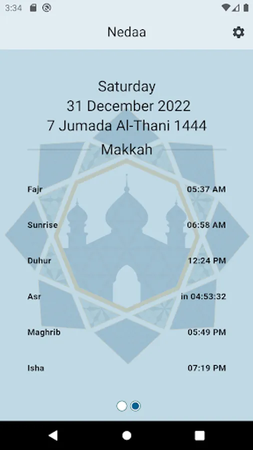 Nedaa calculates Muslims prayer times for the current location of the user, or a manually selected location.