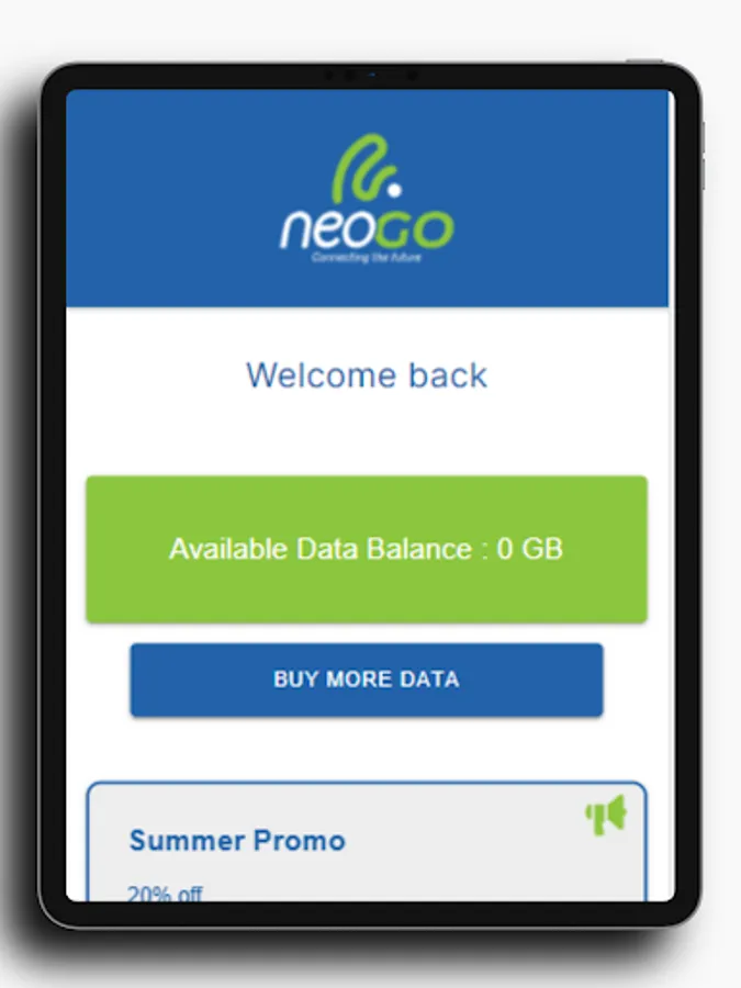 Neo Go - the smart and affordable way to stay connected! With just a few taps, you can register, select your location, and purchase a tailored data bundle. Enjoy fast and reliable wireless internet access at a fraction of the cost. Empower yourself and stay connected with Neo Go