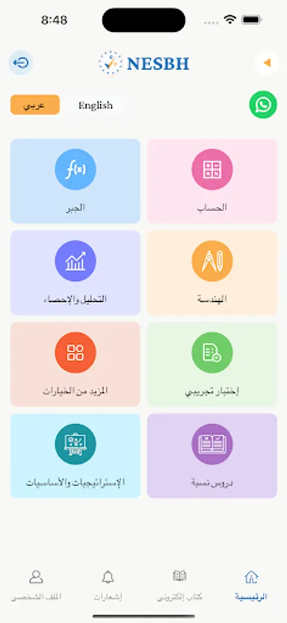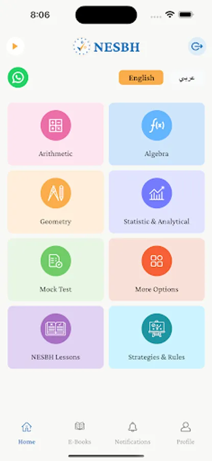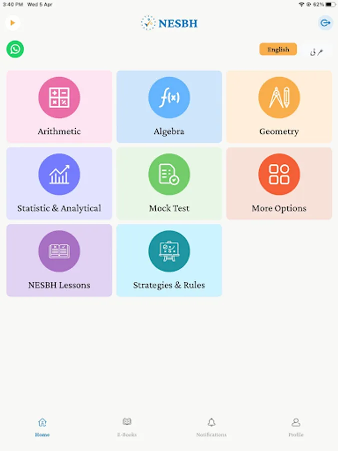 NESBH application for the quantitative aptitude test contains everything that the student needs in order to excel in the test. This application simulates the real exam and helps the student see their skills developing by identifying their weaknesses easily through a graph that shows the number of questions they have answered correctly and the progress they have made in each subject. This application contains in total 6000 Arabic and English questions with video explanations for each question, regardless of its difficulty, and depending on availability new questions will be added. There are also NESBH Lessons that is questions sent by the students that will be explained every week by a mathematics teacher in a video that is around 20-30 minutes.