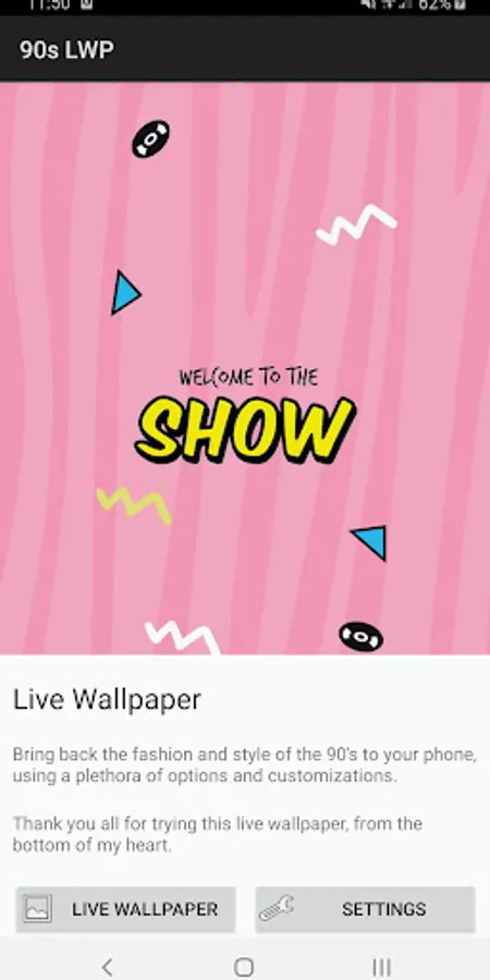 An animated wallpaper in remembrance of the 90's, with customization features, bright colors and free to download. Optimized for Android API 21 and up.