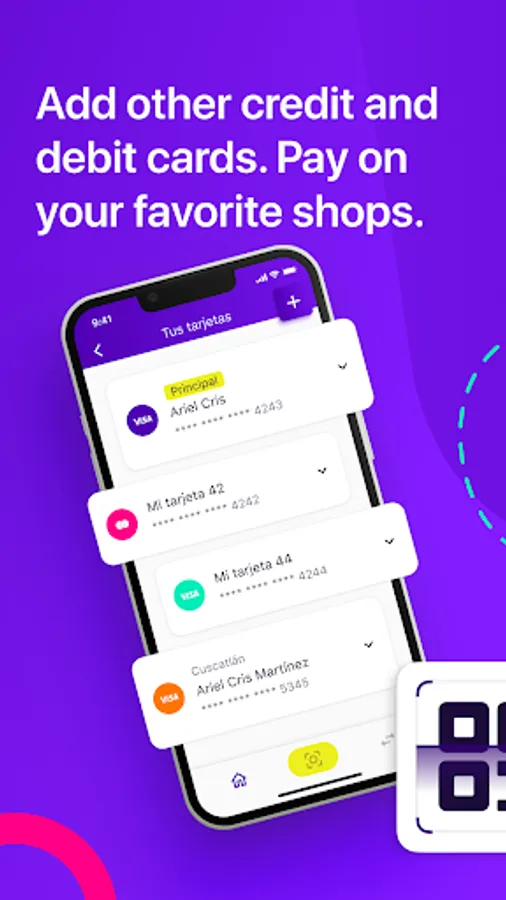 - Add credit and debit cards from any bank to pay in all affiliated shops.