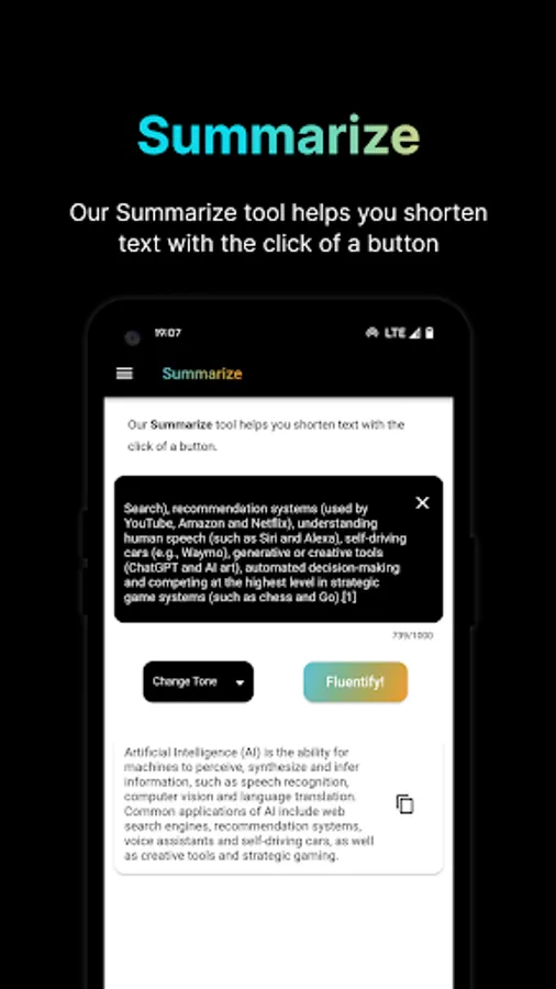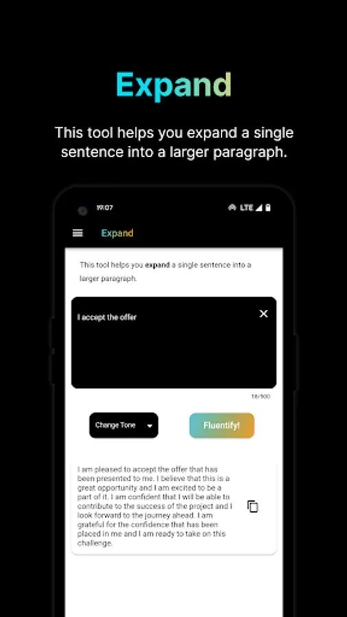 Fluentify also has features like Expand, which helps you quickly write a longer paragraph based on a simple sentence, and Summarize, which let's you shorten your text with one click. You can also choose from different tones to match your context, such as business, formal, or casual. Fluentify is easy to use, fast and effective.