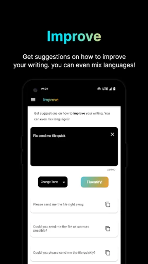 Writing better English can be challenging, especially if you don’t have a native speaker to help you. But with Fluentify, you don’t need one. Fluentify is more than just a grammar checker. It’s an AI-powered writing assistant that can rewrite your sentences for you, making them more fluent and native sounding. Whether you need to write an email, a report, a social media post, or just want to chat with confidence, Fluentify makes you seem like a native speaker immediately. It works like a translator, but instead of changing languages, it changes your level of fluency. Although it's possible to use words from another language too; just type what you want to say and let the app do the rest. Compare your original sentence with the rewritten one and learn from the differences.