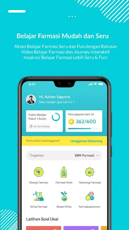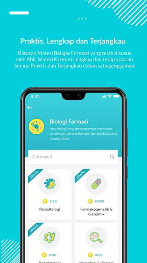 Starting from watching study videos, practicing questions, private lessons, try outs, looking for work, news media can be accessed via smartphone. The content is available for various levels from High School of Pharmacy (SMF), Pharmacy Diploma (D3), Bachelor of Pharmacy (S1), Pharmacists and Pharmacy Technical Personnel according to the national curriculum and specially designed by the best and experienced teachers.
