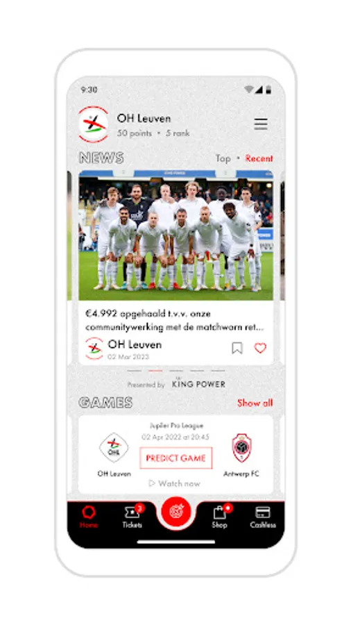 Snel iets kopen in de fanshop of een ticket voor een thuiswedstrijd? Dit kan ook allemaal in de OH Leuven app.