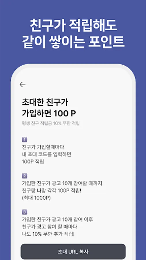 1. If you introduce it to a friend, we will provide a recommendation of 1,000 won each to a friend and a member (100 won X10 times from the first sign up of a friend until 10 advertisements participate)