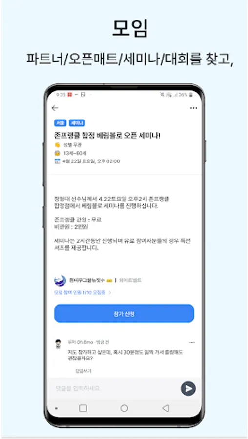 - Meetings: Create jiu-jitsu meetings with various themes such as partners/open mats/seminars/contests! You can set various items such as date, region, gender, and age.