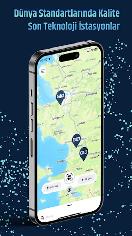 GIOEV mobile application where Electric Vehicle Charging Stations prepared by GIOEV for our end users can be displayed on the Map, the services around the Charging Station for our end users are displayed, and the charging process can be started and terminated after the vehicle connection is established with the charging station selected on the map.