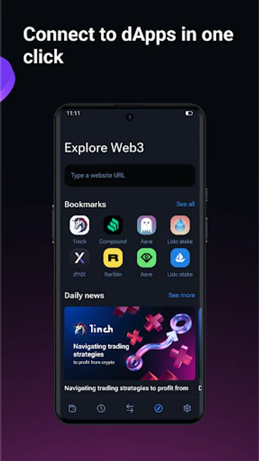 Acting as a gateway to Web3, the app allows users to access dApps, collect NFTs and use DeFi protocols. With the 1inch Wallet, you can trade and manage tokens across 10+ networks and discover all of Web3 in one app.