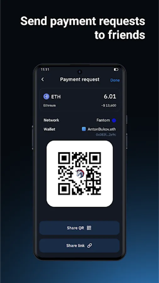 Receive the exact amount of tokens by sharing a QR code or payment link.
