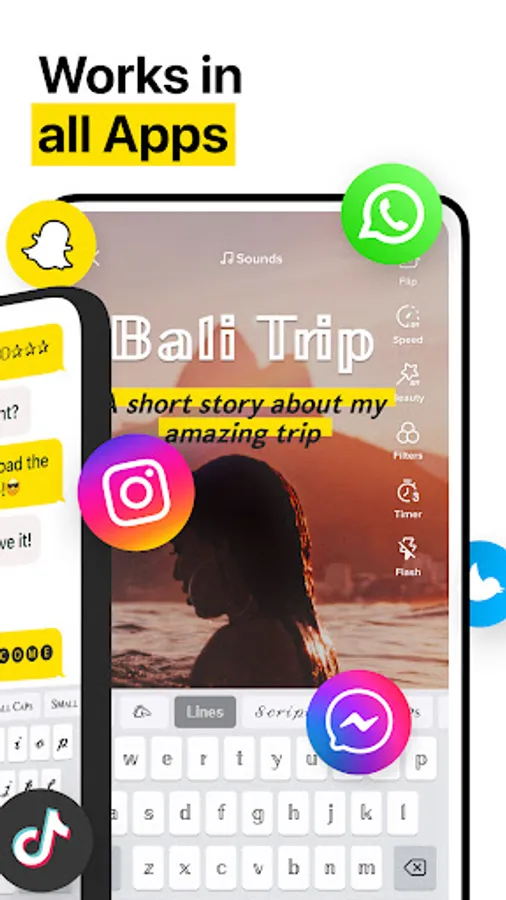 Show you style on social media! Decorate your Instagram bio and stories with free cursive letters or take your Whatsapp conversation with your friends to the next level with a cursive writing keyboard. Want to impress your soul mate in Tiktok app? With a cool fancy text from our stunning app, you can make a good impression with a couple of letters!