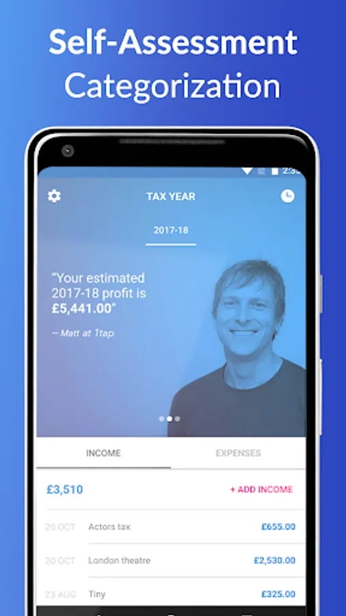 Track your self employed expenses, income and tax liability (i.e. how much in taxes you have to pay) in real-time without having to type anything in with 1tap tax!