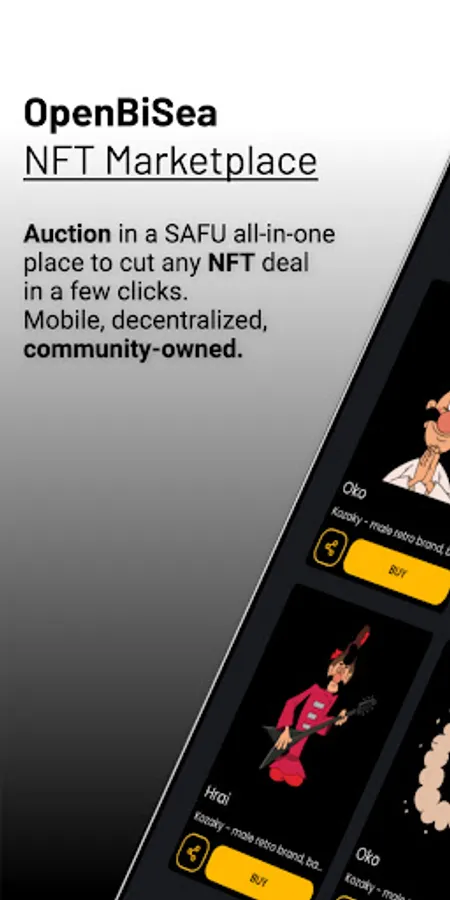 A first front end solution for OpenBiSea is a mobile app and web UI app, where investors, influencers, license companies, brands can purchase or sell some NFT with BNB/BUSD in wallet or credit card. Purchases have two types — auctions or direct sales. You 100% control wallet and ownership with easy to use flow, no need to become a crypto specialist.