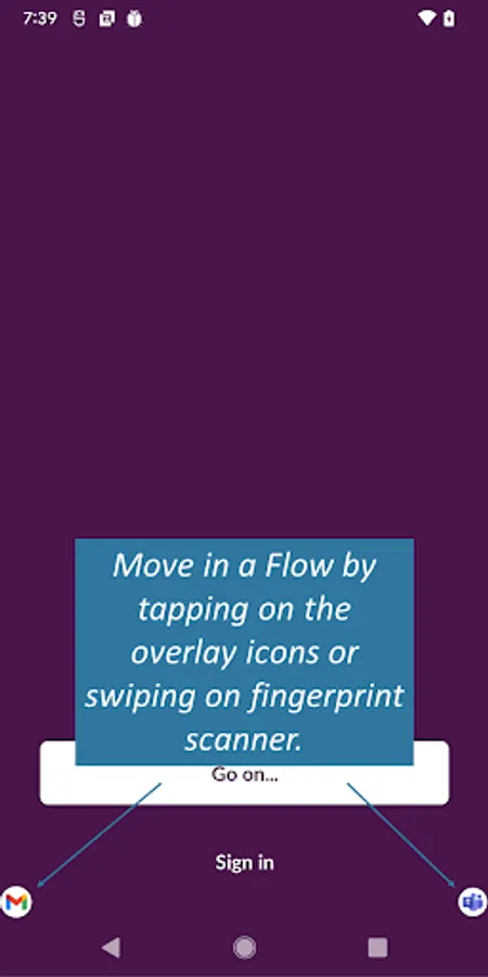Once a Flow is launched, you can move between apps in it by swiping left or right on the fingerprint scanner, or tapping on the overlay icons that appears at the bottom of the screen.