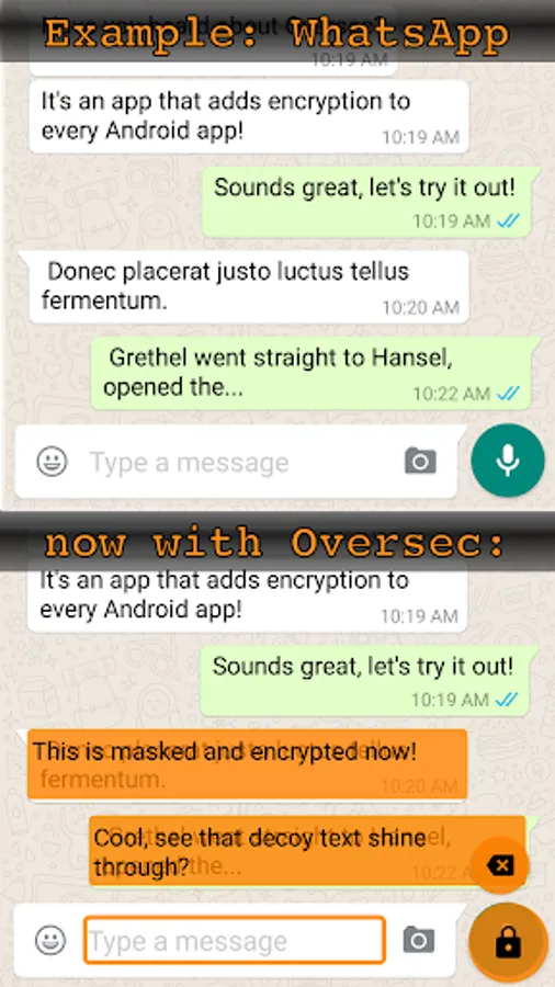 Oversec also features a unique way of encoding the encrypted messages. It stores the encrypted text in invisible (zero-width) characters and let's you add decoy text at the end. That way, a message will just show e.g. "The sun is shining!" with no visible sign of any encryption, whereas in reality it contains a hidden encrypted message.