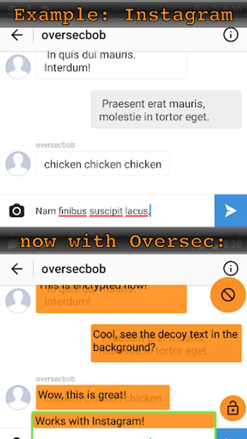 In order to encrypt a text, Oversec shows a button next to an active input field. After having entered the secret text, tapping that button makes Oversec read the text, encrypt it and put back the encrypted text into the field. It is now ready to be sent in the subjacent app as usual - the app doesn't even know that it is sending encrypted data!