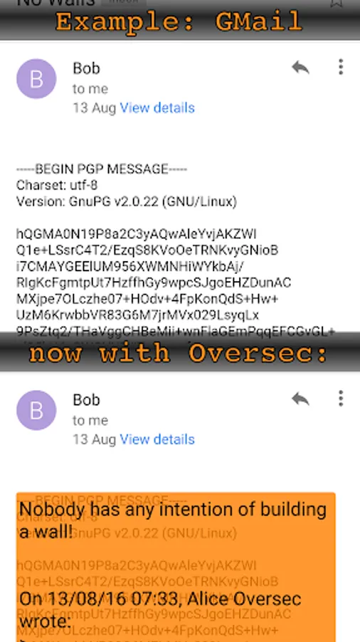 Oversec constantly monitors the text on your screen. When it finds an encrypted text, it tries to decrypt it and then shows the decrypted text as an overlay in place of the encrypted text. Conversely, it can read text out of an input field, encrypt it, and then put the encrypted text back into the input field.