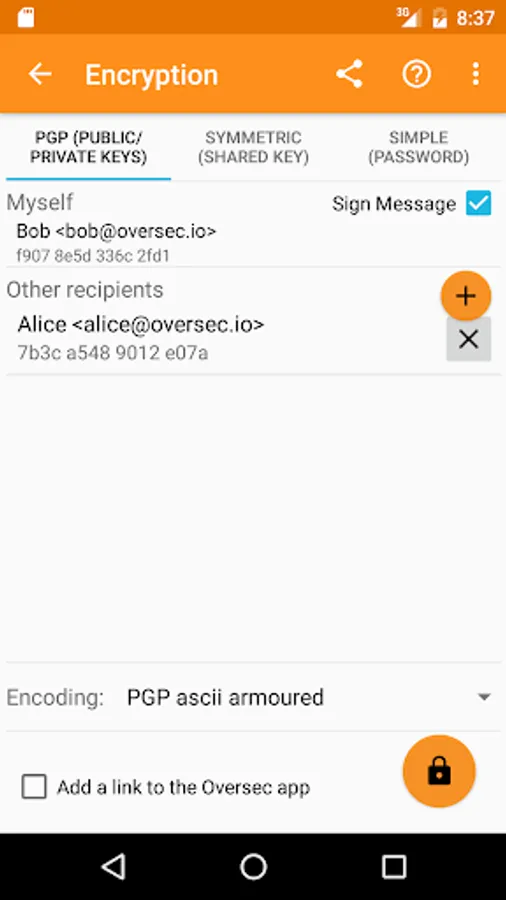 Oversec encrypts your data either using symmetric keys (using ChaCha20 cipher + Poly1305 MAC ) or using asymmetric PGP encryption (making use of the OpenKeychain app [https://www.google.com/url?q=https://play.google.com/store/apps/details?id=org.sufficientlysecure.keychain]).