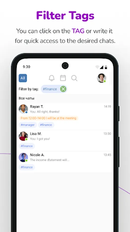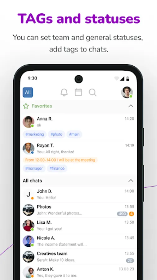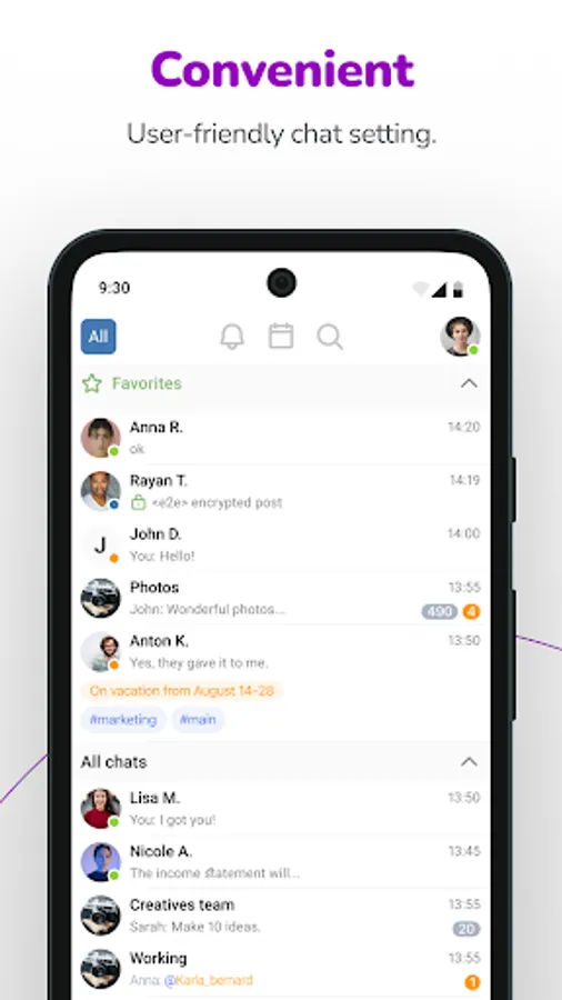 Simply create chats, invite your friends and colleagues as required. Just write the name of the participant and they will automatically be added to the chat.