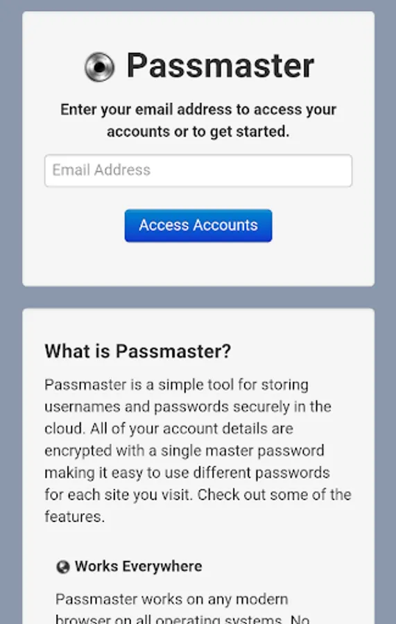 Passmaster uses service workers and local storage to make your account details accessible even while you are offline. Your data is automatically synced each time you use Passmaster ensuring it is available whenever you need it.
