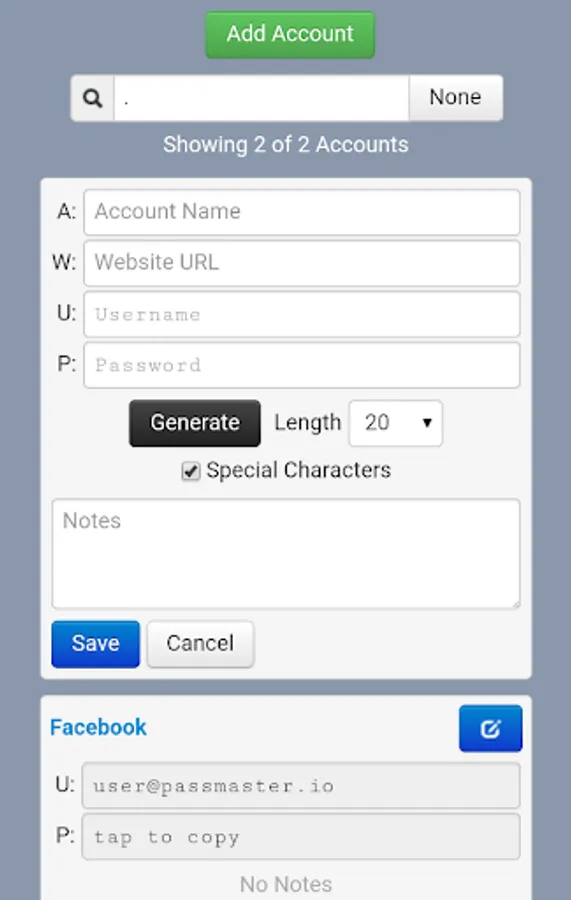 Passmaster is designed to store usernames and passwords for all the websites you use but can store other related information as well. There's space for account numbers, security questions, website URLs, or anything else you else you might need.