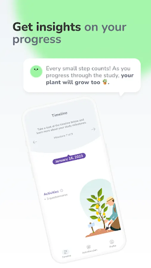 It can be hard to remember all the tasks that need to be done as part of the study’s protocol. Pat, our empathic virtual assistant, guides you through data reporting by helping you identify the activities that need to be completed at the right moments. Pat provides you with reminders and motivational messages to support you throughout the study, from beginning to end.
