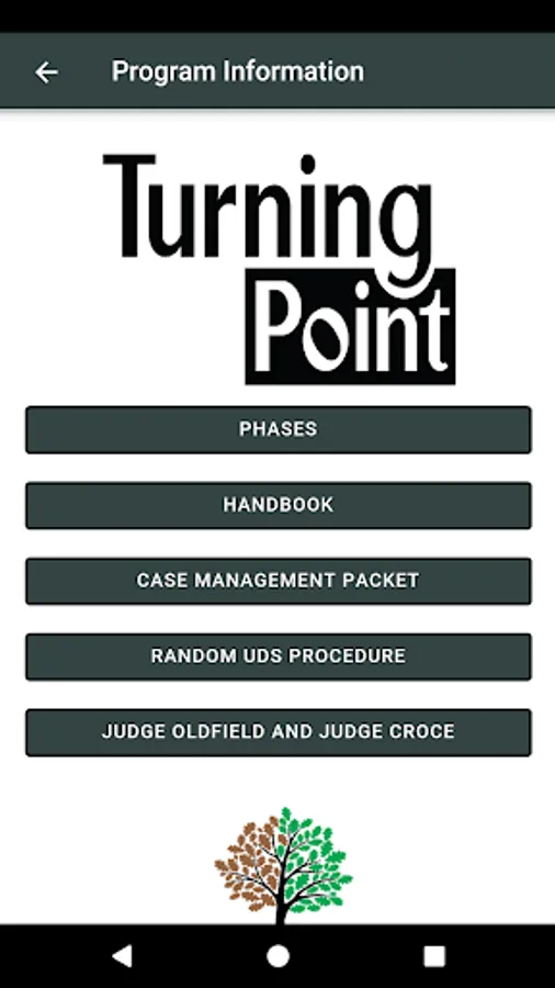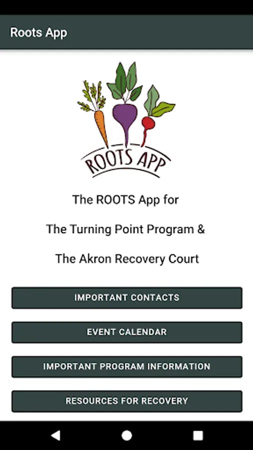 The ROOTSApp is a one stop shop for individuals participating in The Turning Point and Recovery Court programs. Managed by the primary treatment provider for these Programs, the ROOTSApp contains important contact information, an events calendar, and connections to local resources.