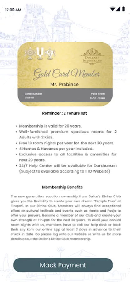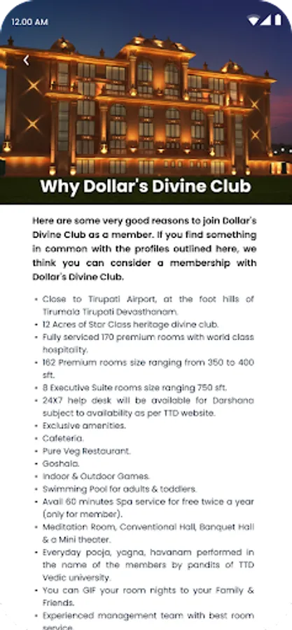 Your annual stay with us has to be booked 15 days in advance along with a visit to Tirumala and can also be utilised to plan and offer any Homam, Gau Pooja and your prayers to other equally illustrious and important temples near and around Dollar’s Grand Club. Become a member of our Club, so that you can create your own power at Tirupati for 20 years. Do please call us or write to us for more details on how to obtain a Dollar’s Grand Club membership.