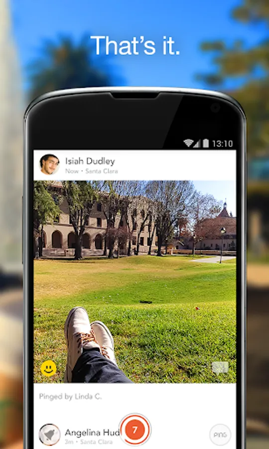Do you want to know what your friends are doing, where they’re hanging RIGHT NOW? Ping them and get their real-time point of view (POV) photo in an instant! They can then ping you back. Despite being in different places, you will feel close to them at all times.