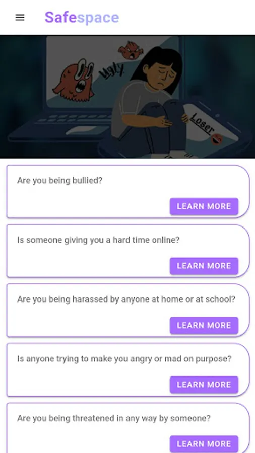 Safe Space is a mobile application that aims to tackle cyberbullying experienced by teenagers and young adults. Cyberbullying, unlike traditional bullying, is more public and can even result in hundreds even thousands of people contributing to cyberbullying. Bullying can also easily go from the online spaces to the offline world where it can then take the form of physical harm. This often leads to self-harm, low self-esteem and in some tragic cases, suicide by the victims of this new form of cyberbullying. So, we developed an App that allows the user to get sufficient information about online violence and the help they can get. The app will allow the user to get automatic virtual counselling from our specialised child protection officers who will assess the matter and assist the child should they report.