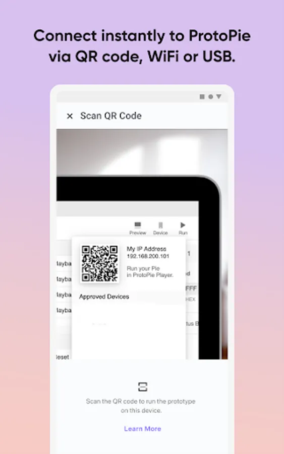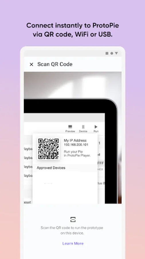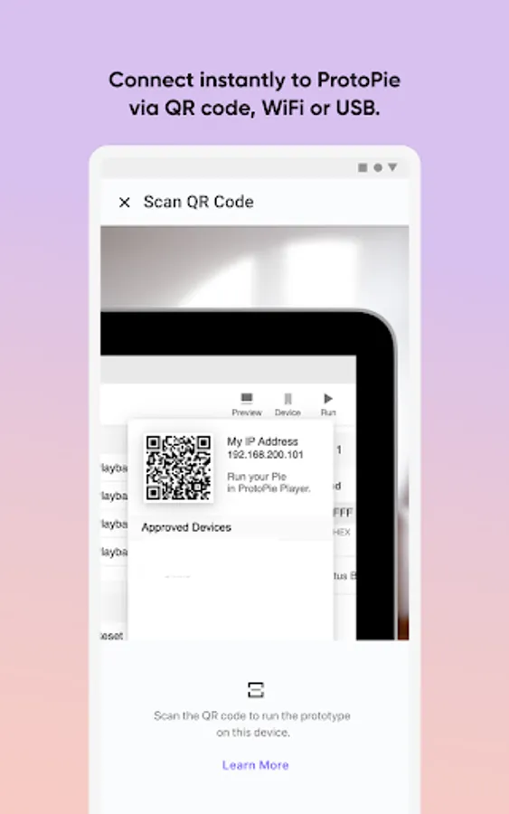 To open prototypes on your Android device, connect ProtoPie Player to ProtoPie Studio via WiFi or USB. Or just log in with your ProtoPie account to access your prototypes in the cloud.