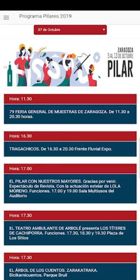 Application to be able to see the program of the 2022 Pilar festivities by days, by intelligent search, as well as general information about the festivities.Pilares 2022 Zaragoza.
