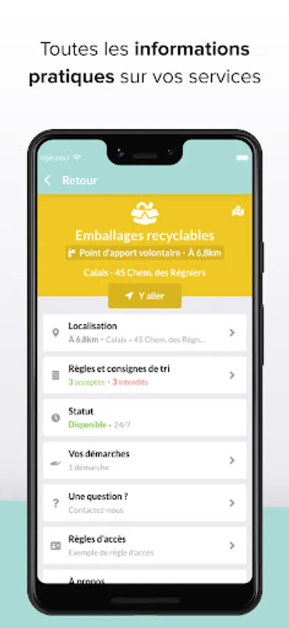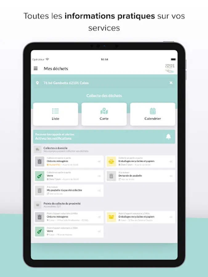 The My Waste - Grand Calais app is the new official app for your waste service! It lists all the useful information for sorting and reducing your waste, depending on your address: personalized collection schedule, position and availability of local collection points, sorting instructions, timetables and practical information on recycling centers, and even more.