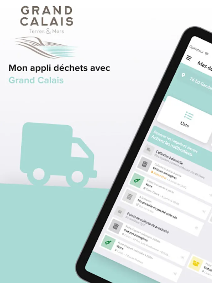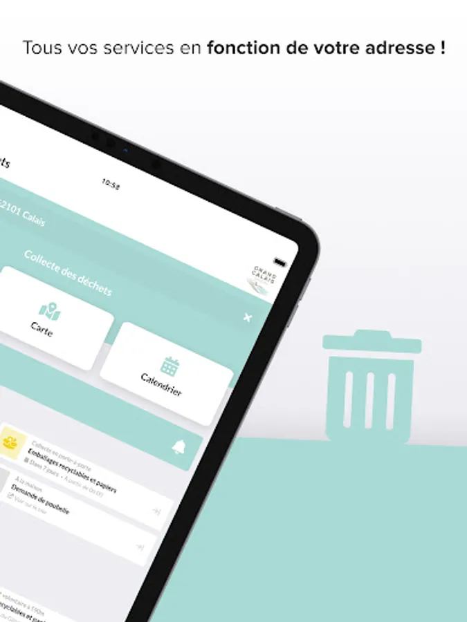 The application delivers personalized and real-time information on collection postponements at your address, changes in schedules or closures of recycling centers or special measures taken by the Grand Calais Terres & Mers Agglomeration Community.