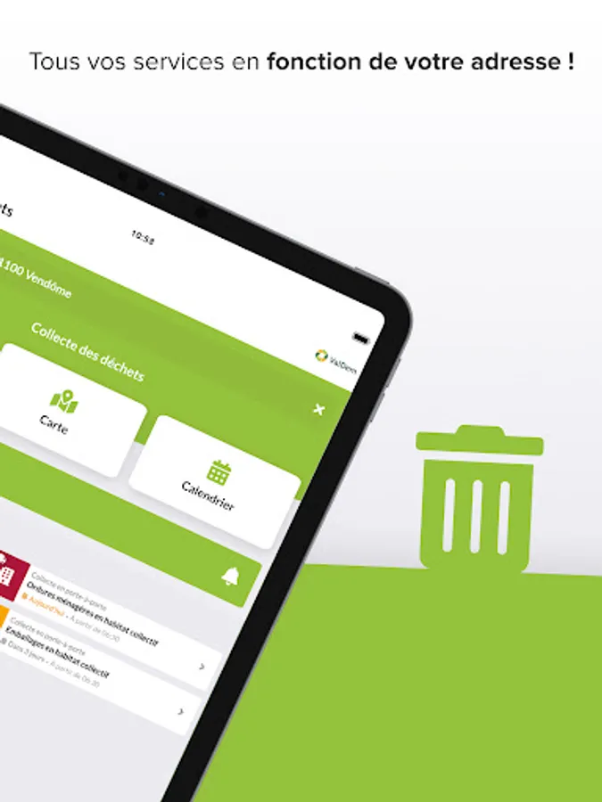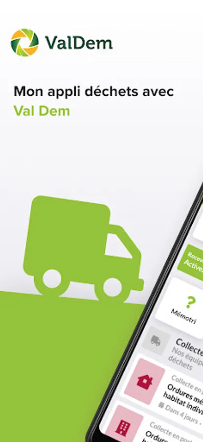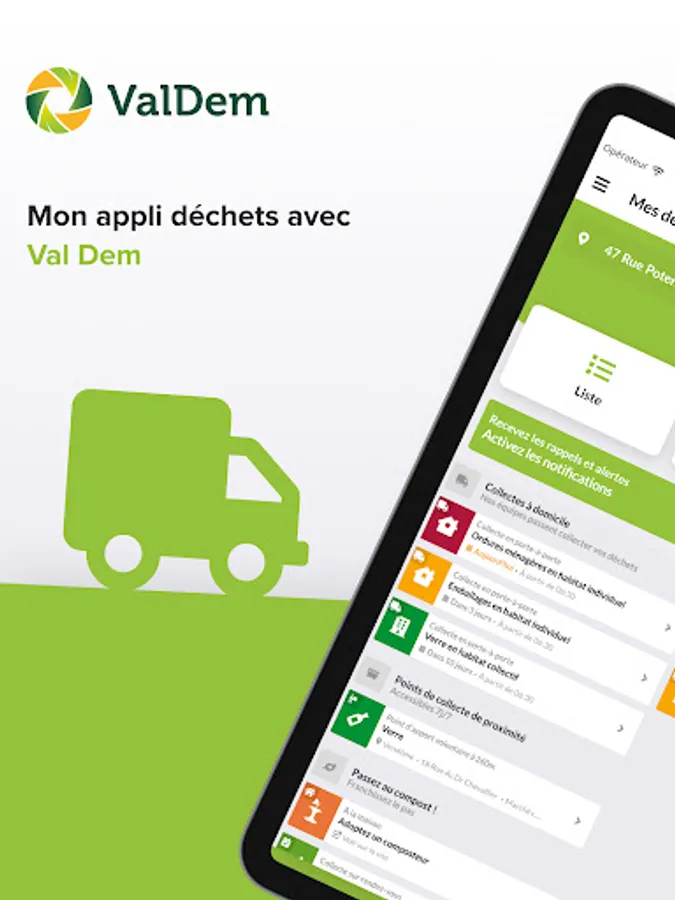 The My Waste - ValDem application is the new official application of the ValDem union! It lists all the information useful for sorting and reducing your waste, depending on your address: personalized collection schedule, location and availability of nearby collection points, timetables and practical information on waste reception centers, sorting instructions and much more. Moreover.