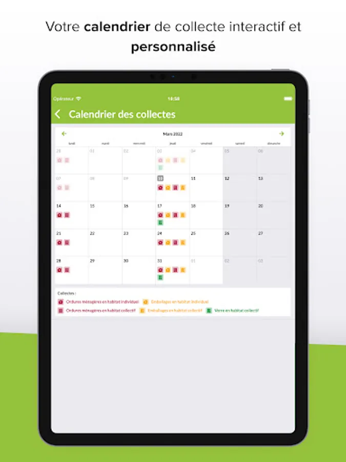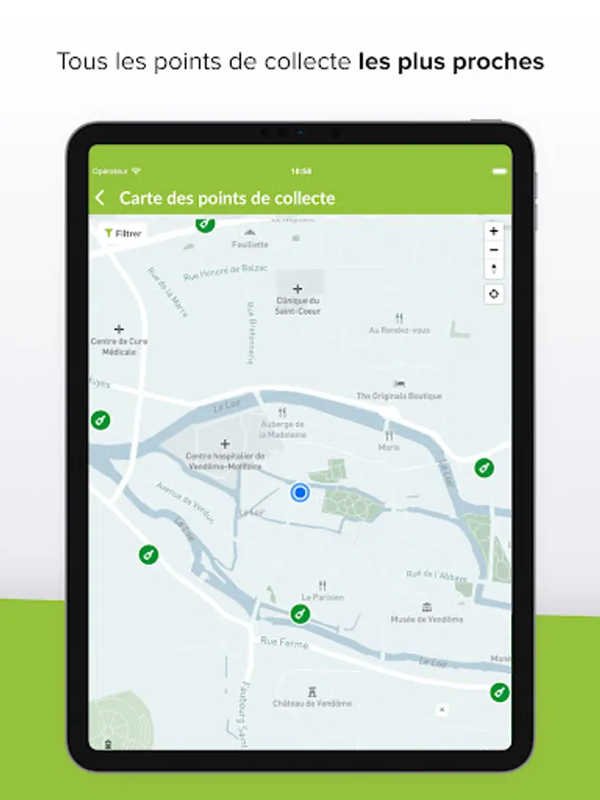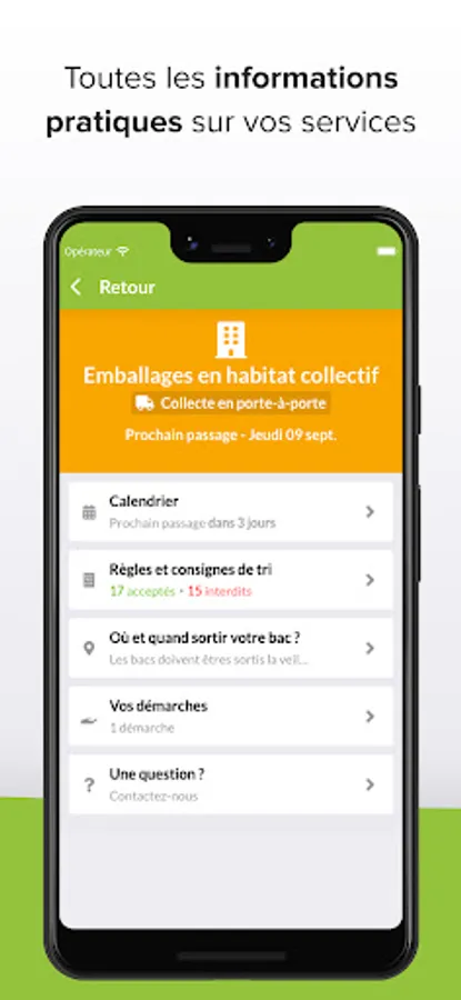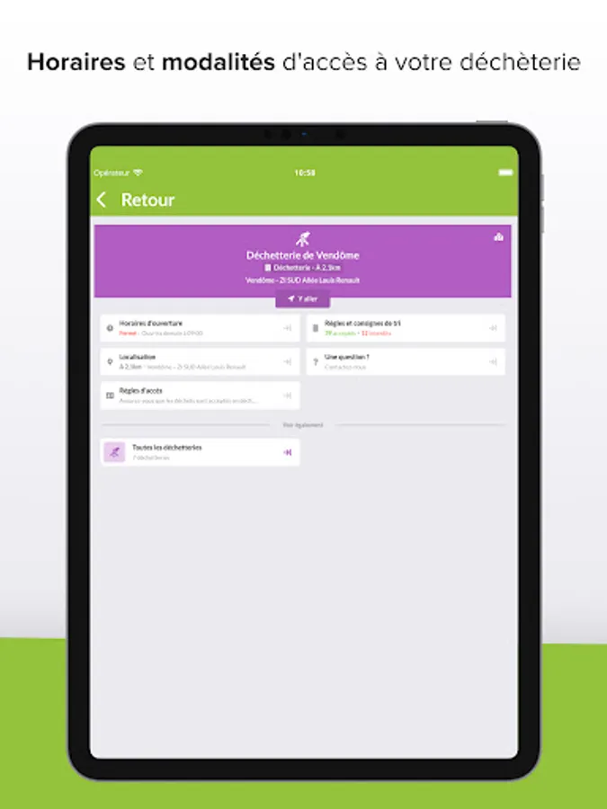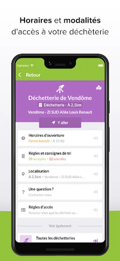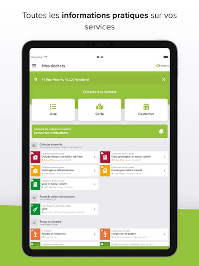 The application identifies the collection points closest to you using geolocation, and gives you the rules and sorting instructions. You may discover places to repair and exchange (recycling center, co-repair workshop), how to get a composter and what to do with green waste. Finally, you will no longer have any doubts about the opening hours of the waste reception centers: the right information is in the application!