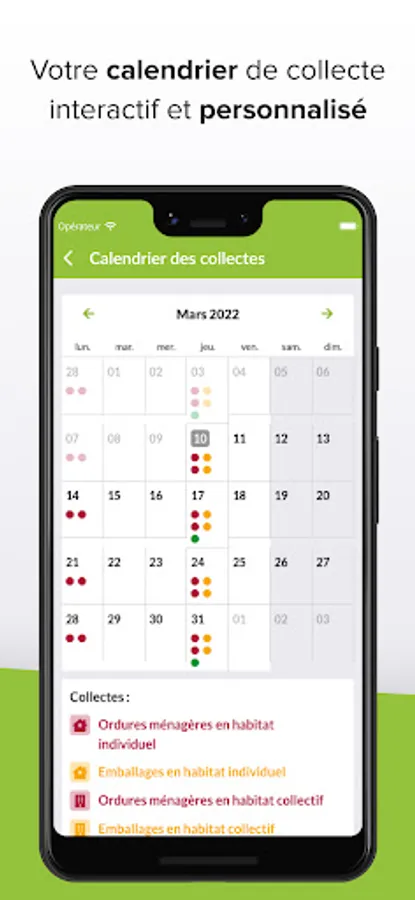 The application automatically gives you the day of the next truck visit for household garbage, packaging / paper collections. You also have access to the annual collection schedule, including public holidays.