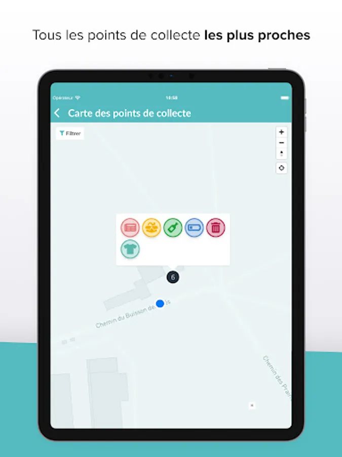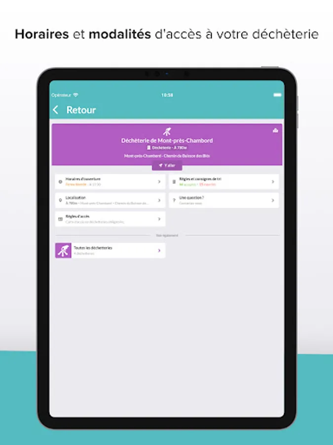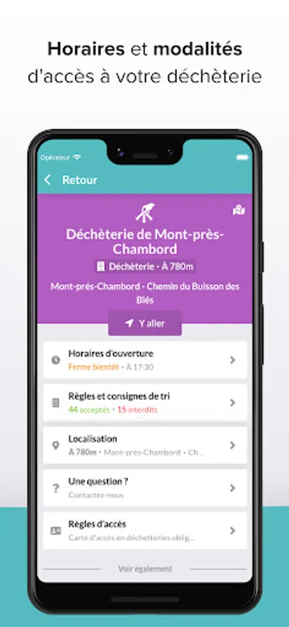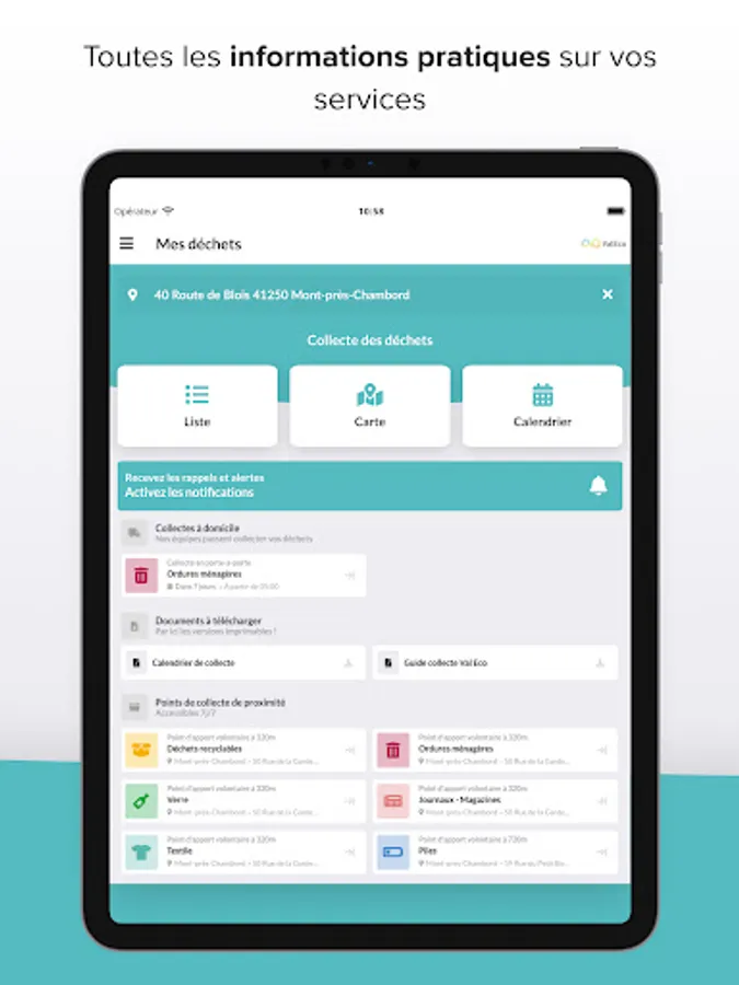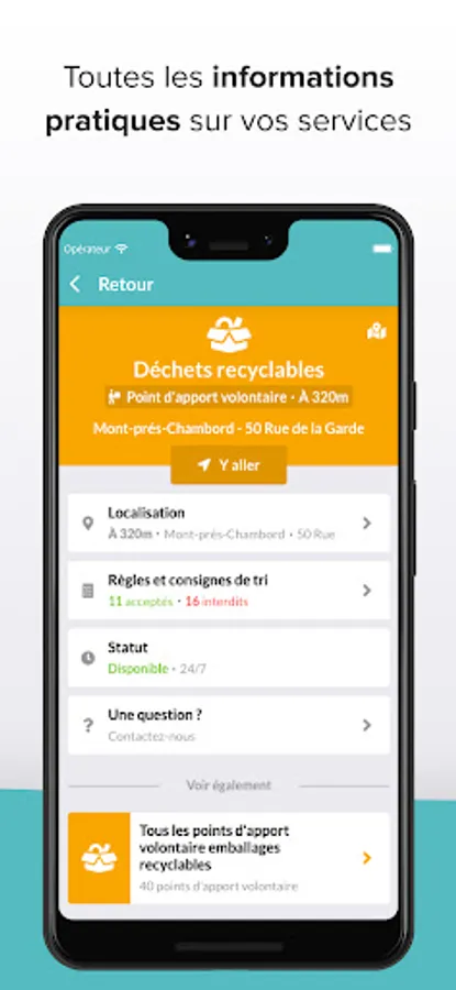 The application identifies the collection points closest to you using geolocation, and gives you the rules and sorting instructions for glass, bio-waste, household waste and packaging. You may find out where to donate, how to opt for composting, and what to do with batteries, medicines, etc. Finally, you will no longer have any doubts about the opening hours of the recycling centers: the right information is in the application!